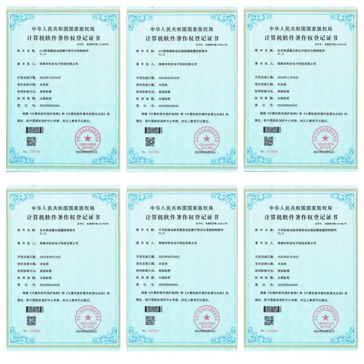 软件著作权名称分别为GIS特高频放电监测中控后台控制软件V1.0、GIS特高频放电在线监测装置控制软件V1.0、红外热成像分析仪中控后台控制软件V1.0、红外热成像仪装置控制软件V1.0、开关柜地电波局部放电监测中控后台系统控制软件V1.0、开关柜地电波局部放电在线监测装置控制软件V1.0。