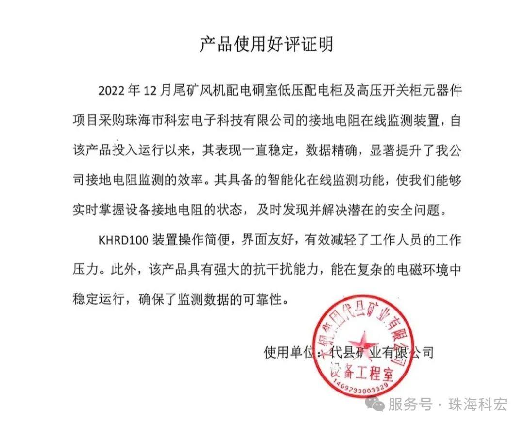 近日,太钢集团代县矿业对我司的接地电阻在线监测装置给予了高度评价,这一反馈无疑是对我们产品性能和服务质量的有力肯定。