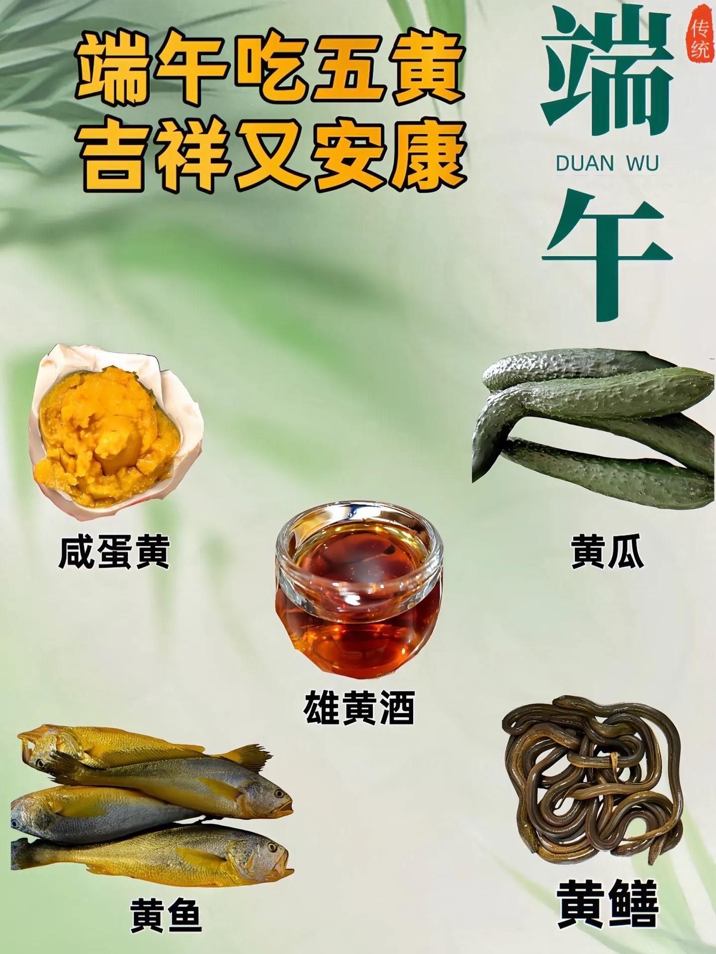 在端午节,还有吃五黄的习俗,即黄鱼、黄瓜、黄鳝、咸鸭蛋黄、雄黄酒。这些食物在端午时节食用,被认为可以祛病防疫、增强体质。