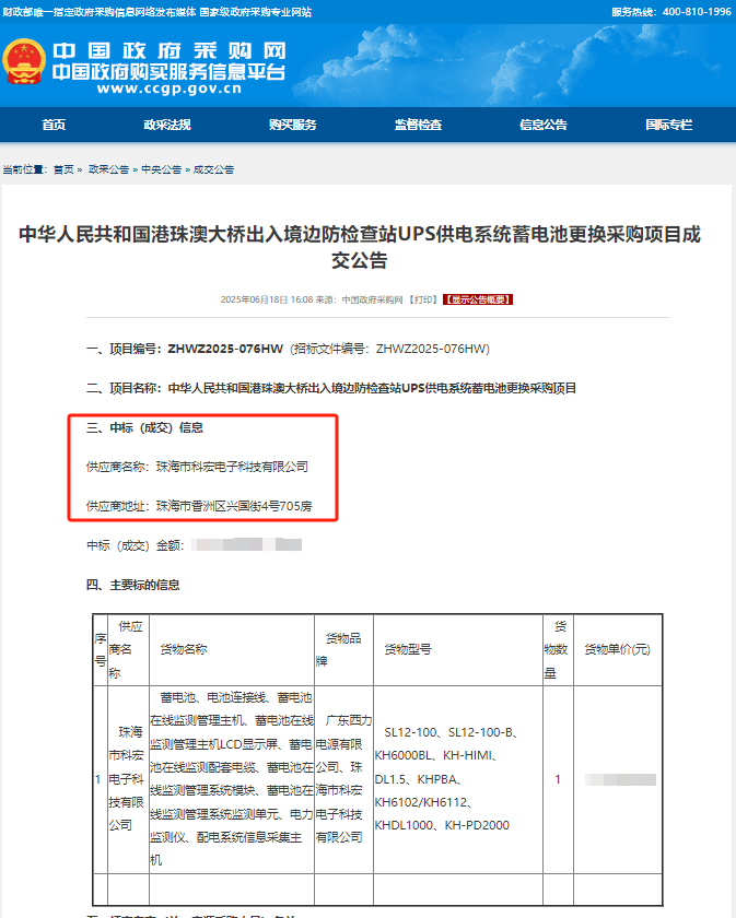 成功中标“中华人民共和国港珠澳大桥出入境边防检查站UPS供电系统蓄电池更换采购项目”。